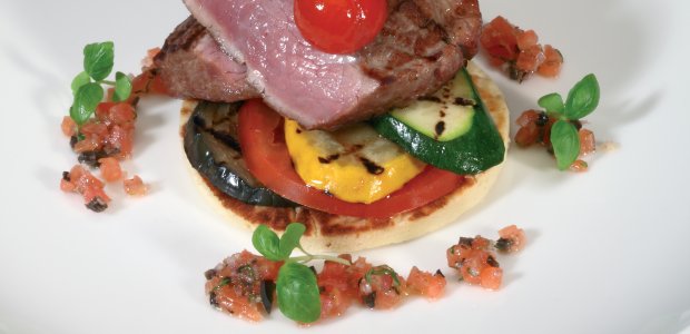 kalfentrecote op aardappelblini met gegrilde ratatouille en antiboise